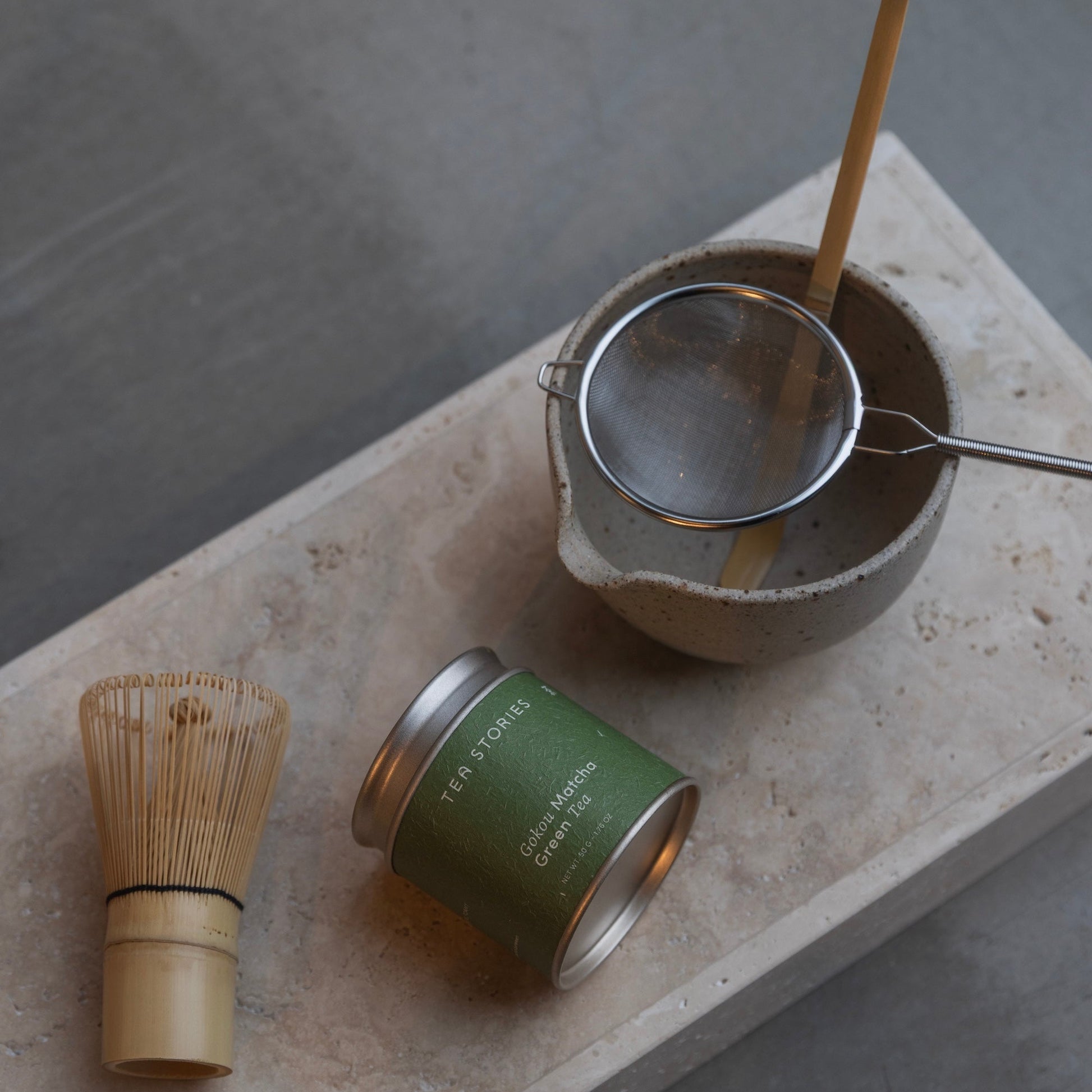 Content: Ceremonial Matcha 50g (Gokou or Samidori), 1 matcha pouring bowl 300 ml, 1 Chasen Bamboo Matcha Whisk, 1 Chashaku Bamboo Matcha Scoop, 1 metal sifter
